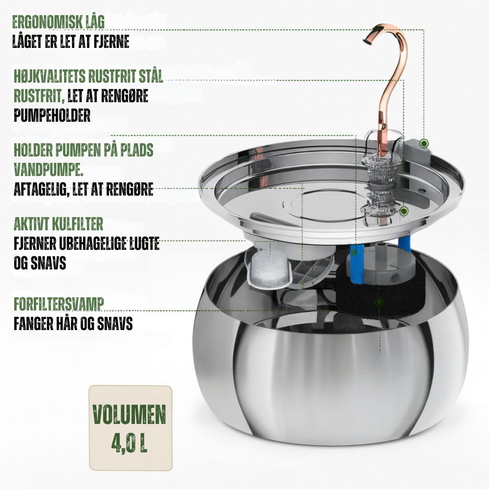 Lavet i rustfrit stål, som modstår bakterier og sikrer at vandet altid er rent og friskt. Let at rengøre og vedligeholde – perfekt til daglig brug.