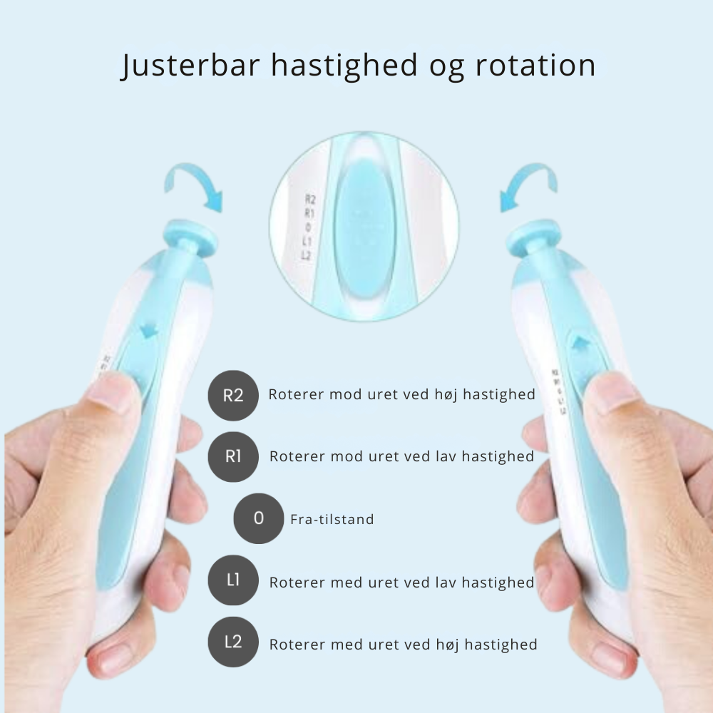 Vores negletrimmer er et smertefrit alternativ til traditionelle negleklippere. Det er slut med at bekymre sig om utilsigtede snitsår eller ubehag forårsaget af skarpe kanter. Det bløde og afrundede filhoved trimmer forsigtigt dit barns negle og sikrer en glat finish hver gang.