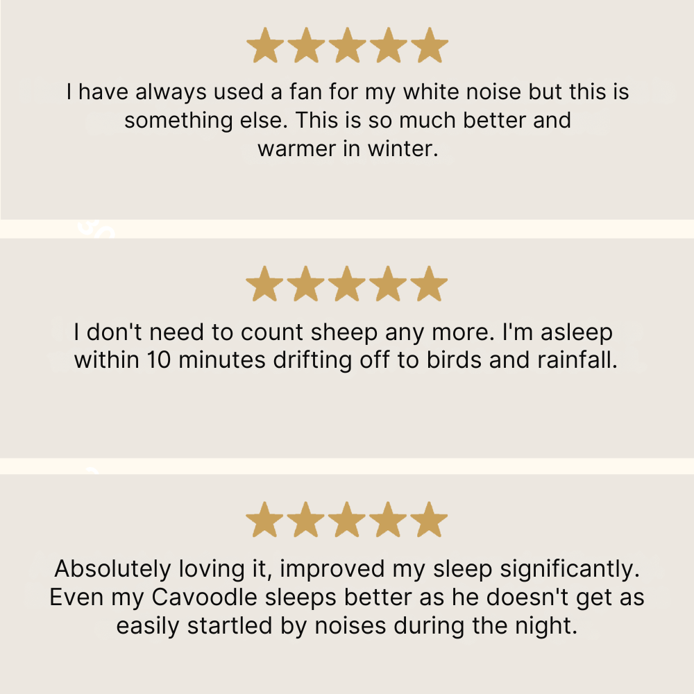 Slumbr™ skaber et beroligende lydtæppe, der hjælper med at overdøve både ydre støj og indre tankemylder. I stedet for at kæmpe med stilheden og uro i kroppen, lader du dig blidt vugge i søvn af naturlige, rytmiske lyde.